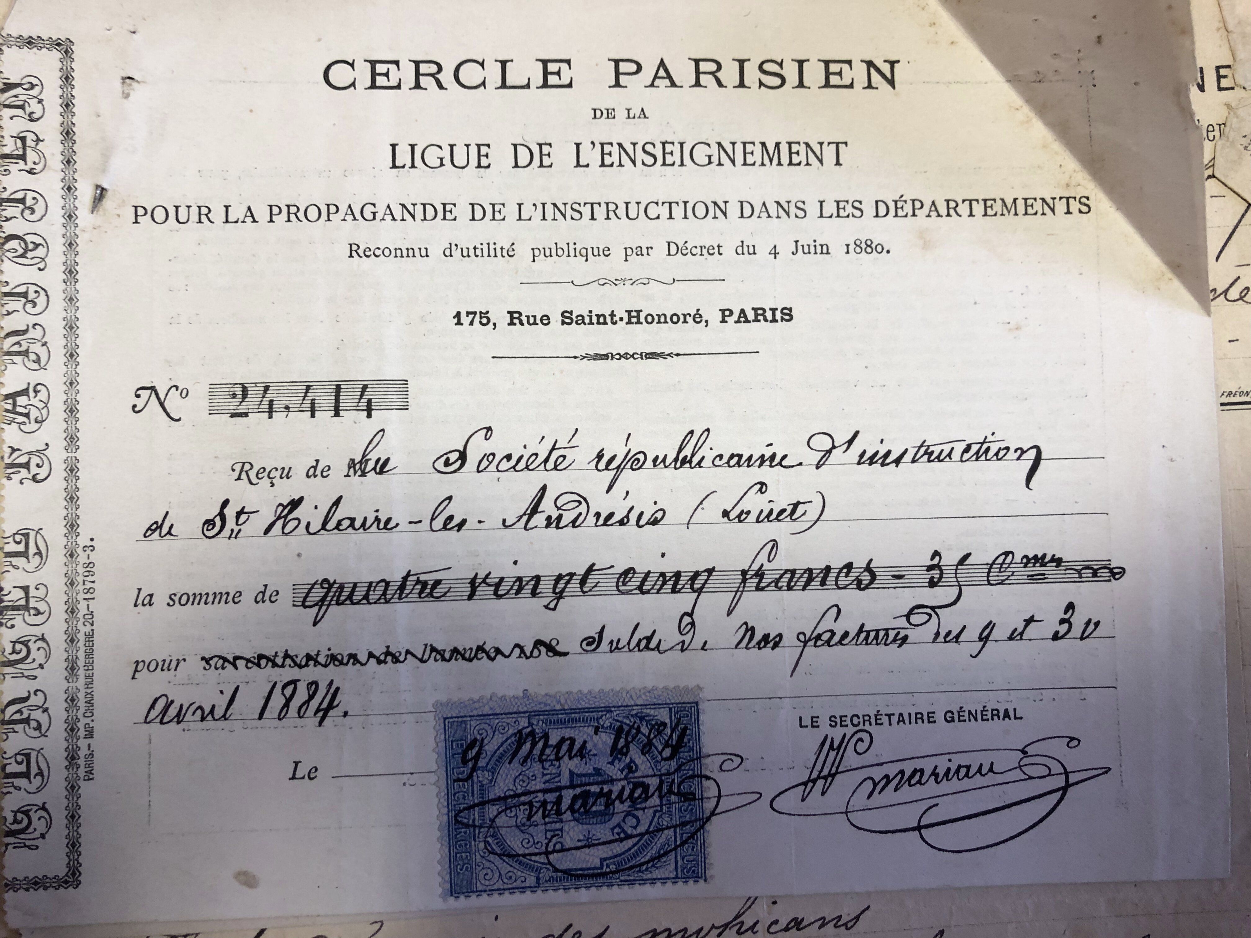 Reçu de la Ligue de l’enseignement adressé à la Société républicaine de Saint-Hilaire (9 mai 1884)