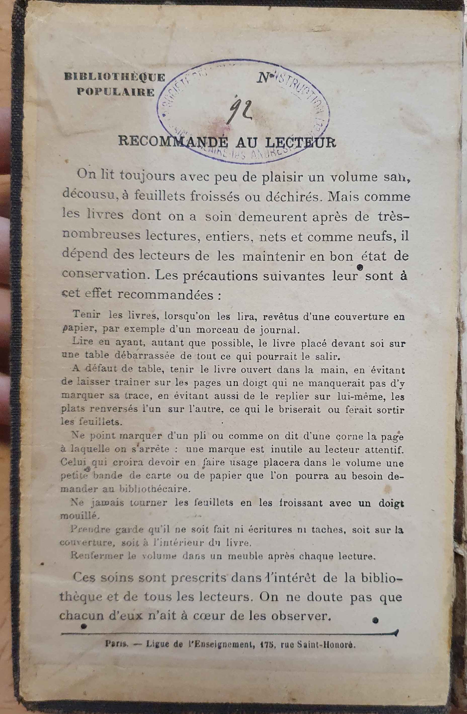 Particularités d'exemplaire : Règlement « Recommandé au lecteur » édité par la Ligue de l'enseignement et collé sur le contreplat supérieur