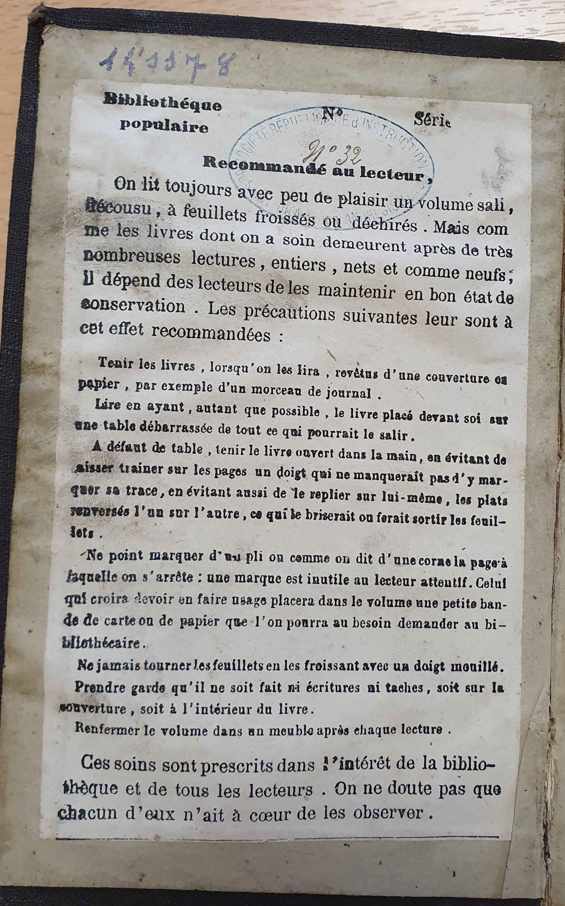• Particularités d'exemplaire : Règlement « Recommandé au lecteur » édité par la Ligue de l'enseignement et collé sur le contreplat supérieur